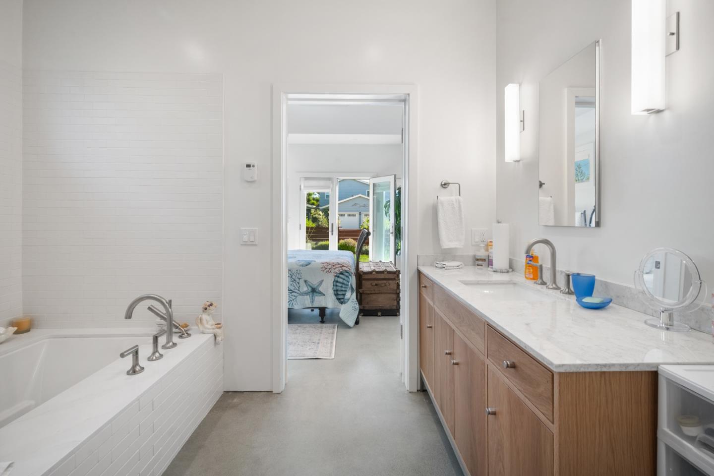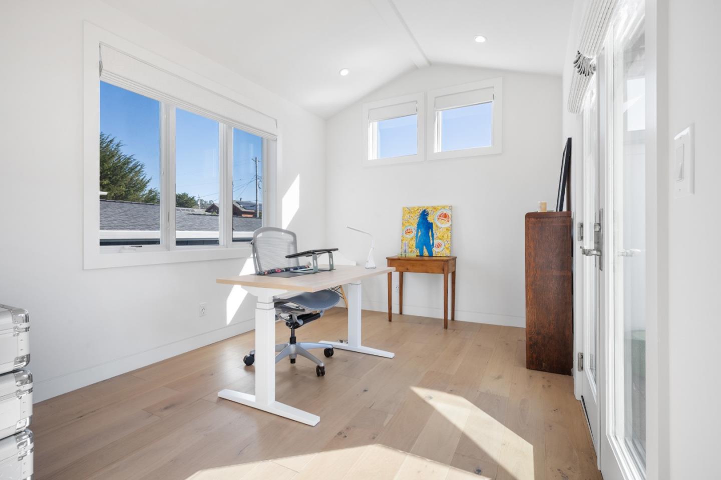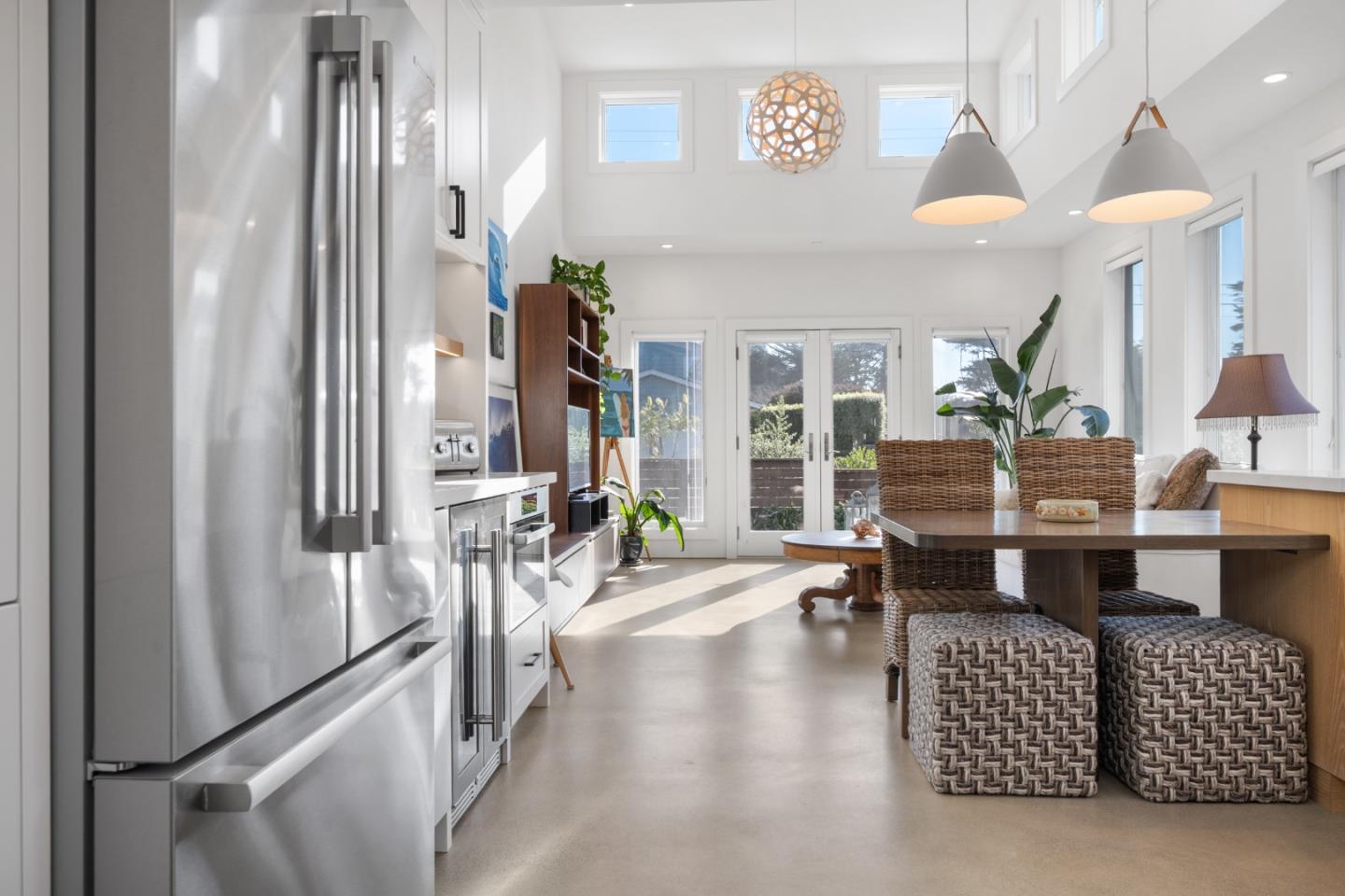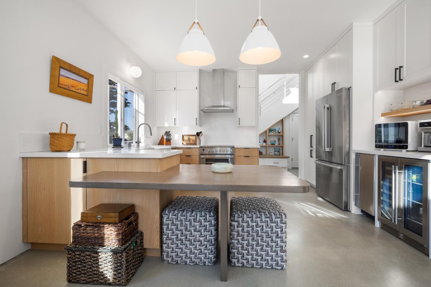 Welcome to Moss Beach, where coastal living meets modern comfort. This light-filled and inviting home features 3 bedrooms and 3 full baths, including a ground floor primary suite with oversized tub and accessible shower, and an upstairs primary suite offering oversized tub and stall shower. The home boasts 2 bedrooms on the ground floor, with ample storage including walk-in closets. The bright and open kitchen is equipped with quartz countertops, an electric oven, and a wine refrigerator, seamlessly integrated into a family room combo perfect for casual dining. Enjoy radiant heated concrete and hardwood flooring throughout the home. Full perimeter fencing surrounds the spacious landscaped yard and garden areas. The two-car garage is fully finished with epoxy floor and storage systems, plus Level 2 electric vehicle hookup. The home includes energy-efficient features like double pane windows, passive solar, 2 Tesla power walls. Enjoy the friendly neighborhood, just steps from Fitzgerald Reserve and the Pacific Ocean. Views of the Moss Beach Enchanted Forest are lovely from upstairs balconies! This home offers a perfect blend of style and functionality, and convenient location close to Highway 1 within commutable distance to SF, Peninsula and South Bay locations. Welcome Home!